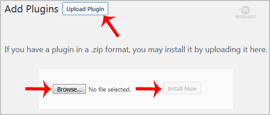 3. Click on Upload Plugin and then on Browse. Chose your plugins zip file and then click on Install Now.